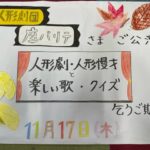 2022年11月19日 / 最終更新日 : 2022年11月19日 shoujakuan 日記 拍手喝采👏👏👏 気持ちがいい季節が続いています 11月の外部ボランティア様『座・パリテ』の皆様がお越しくださり 人形劇、人形漫才、お歌、クイズをご披露下さいました。 準備中より 何が始まるん!?とワクワクしながら待ち 幕が上がると うわ […]